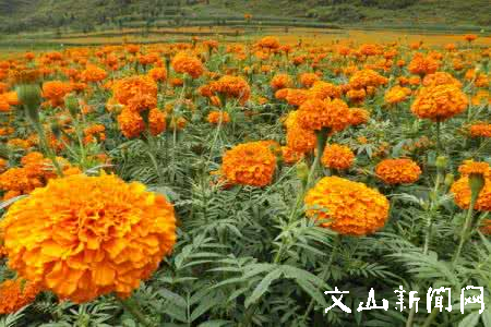为发挥好产业在精准扶贫工作中的重要作用,近年来,文山市按照因地制宜、突出特色、精准施策、重点推进的原则,进一步发展壮大万寿菊产业。眼下正是万寿菊逐渐开放的时节,记者走进小街镇,在田间地头随处都可以看到花农在打理自家的花地。村民张富友家今年种植了10亩万寿菊,看着满地金黄的万寿菊,喜笑颜开。并表示来年还要多发展。在黄泥坡村,村民郭庆庄告诉记者今年他种下了两百亩。自己之所以栽那么多万寿菊,最让他放心的是与公司签订的合同,并且在栽的过程中,相关部门从育苗、移栽等环节进行全程跟踪进行指导。