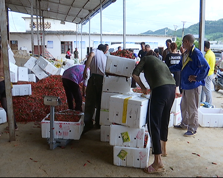 在平坝镇阳佳乐水果蔬菜农民专业合作社的艳红辣椒收购点,记者看到,前来售卖朝天椒的农户络绎不绝,而收购点工作人员正在把辣椒称重、分级、装箱和打包,整个收购工作在有条不紊地进行。