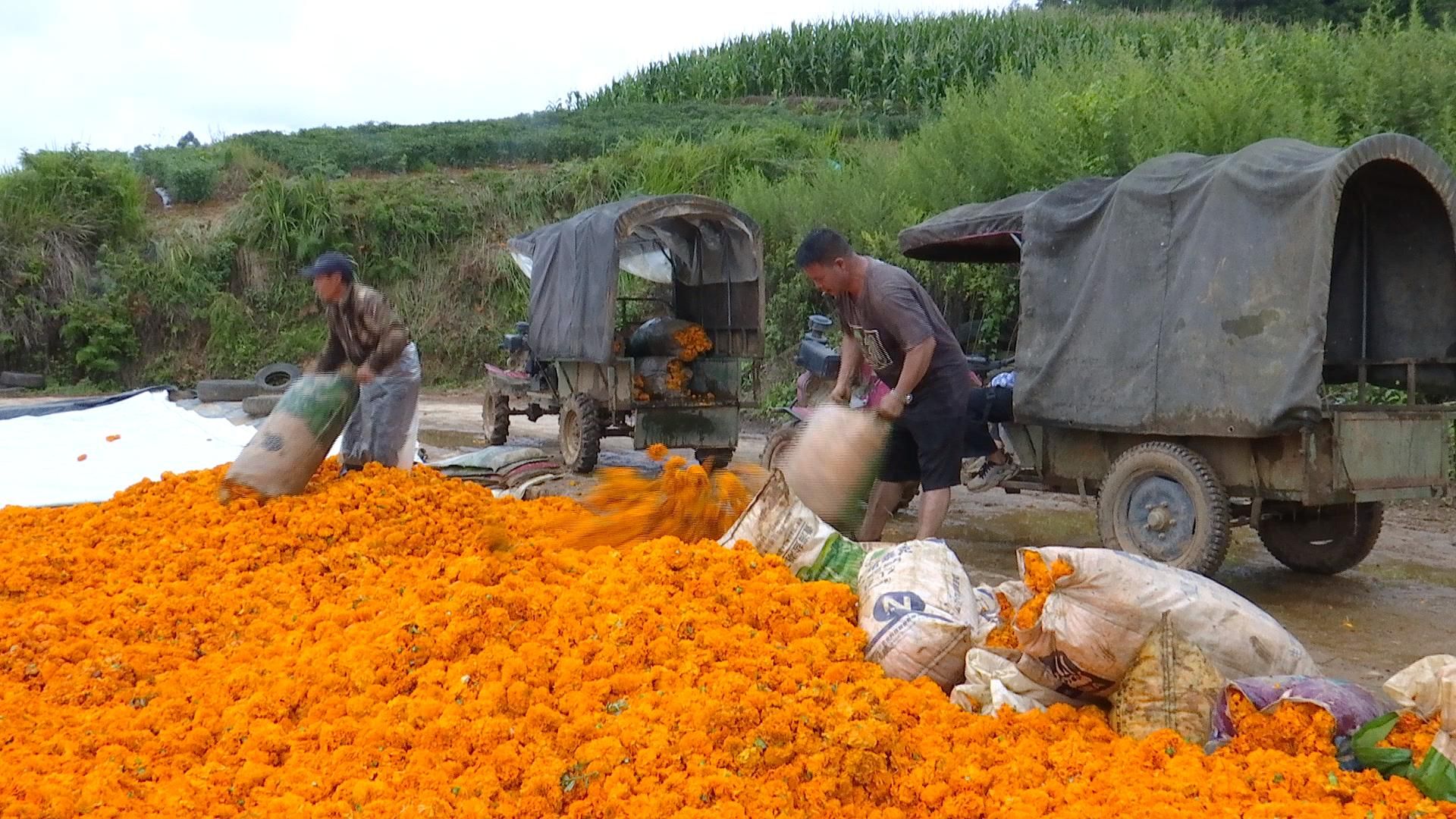 在平坝镇杜孟村的万寿菊收购站,一张张拉着万寿菊的农用车正在过秤、记账、下花,现场工作繁忙而有序。收购站的站长龚韩琼告诉记者,今年万寿菊的长势都还不错,自从6月23日起,收购站开始陆续有花农送花来卖,目前收购站容量1000吨的花池几乎已经装满,万寿菊的采收工作要持续到9月中下旬才会结束。龚韩琼说,今年的花价由去年的1.1元一公斤上涨到1.3元一公斤,不仅如此,为了增加花农们的收入,往年雨季收购要扣除12%—17%的水分价,今年也取消了。