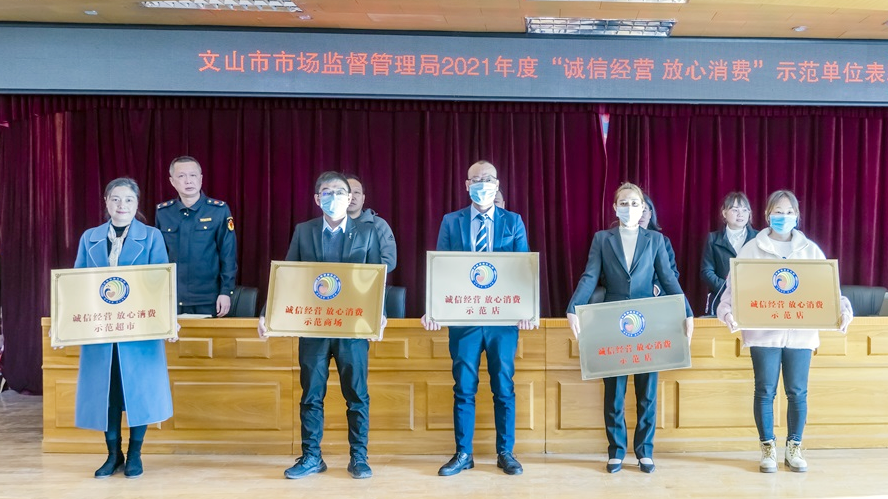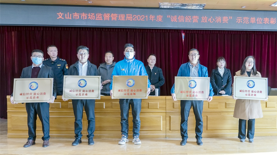 文网讯 为营造放心消费环境,推动市场秩序更加规范、消费环境更加和谐、消费领域诚信体系建设更加完善,12月7日,文山市市场监督管理局对2021年度“诚信经营 放心消费”的10家示范单位进行表彰。