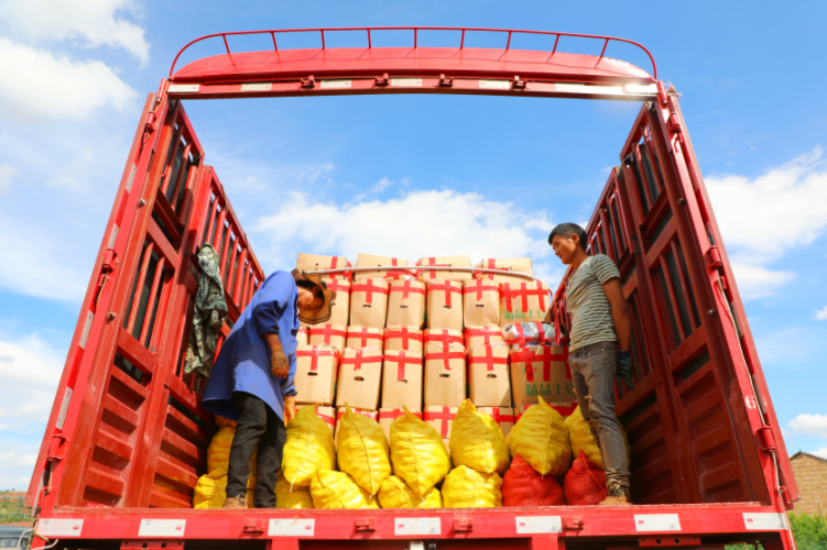 采挖现场,只见工人们提着桶,跟在挖土豆的农机后面,走几步就能捡上一大桶,倒进纸箱里,装箱封胶。为了拉运方便,货车直接开进地里,不一会儿,就装满了整整一车,在喇叭的吼叫声中,奔向了外地。
