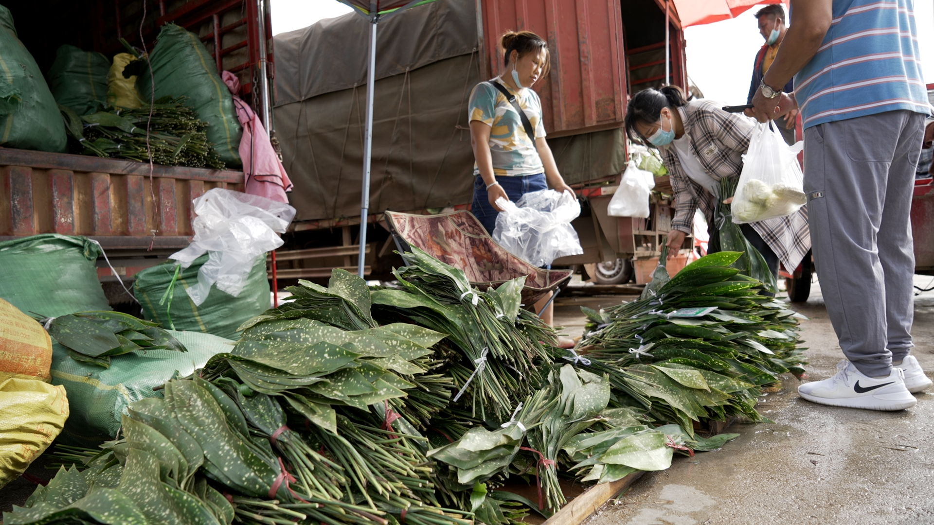在文山城区恒丰农贸市场,一堆堆花粽叶摆在货车、面包车前,按照大小、多少、品质分别绑成了把售卖,前来购买的市民络绎不绝。