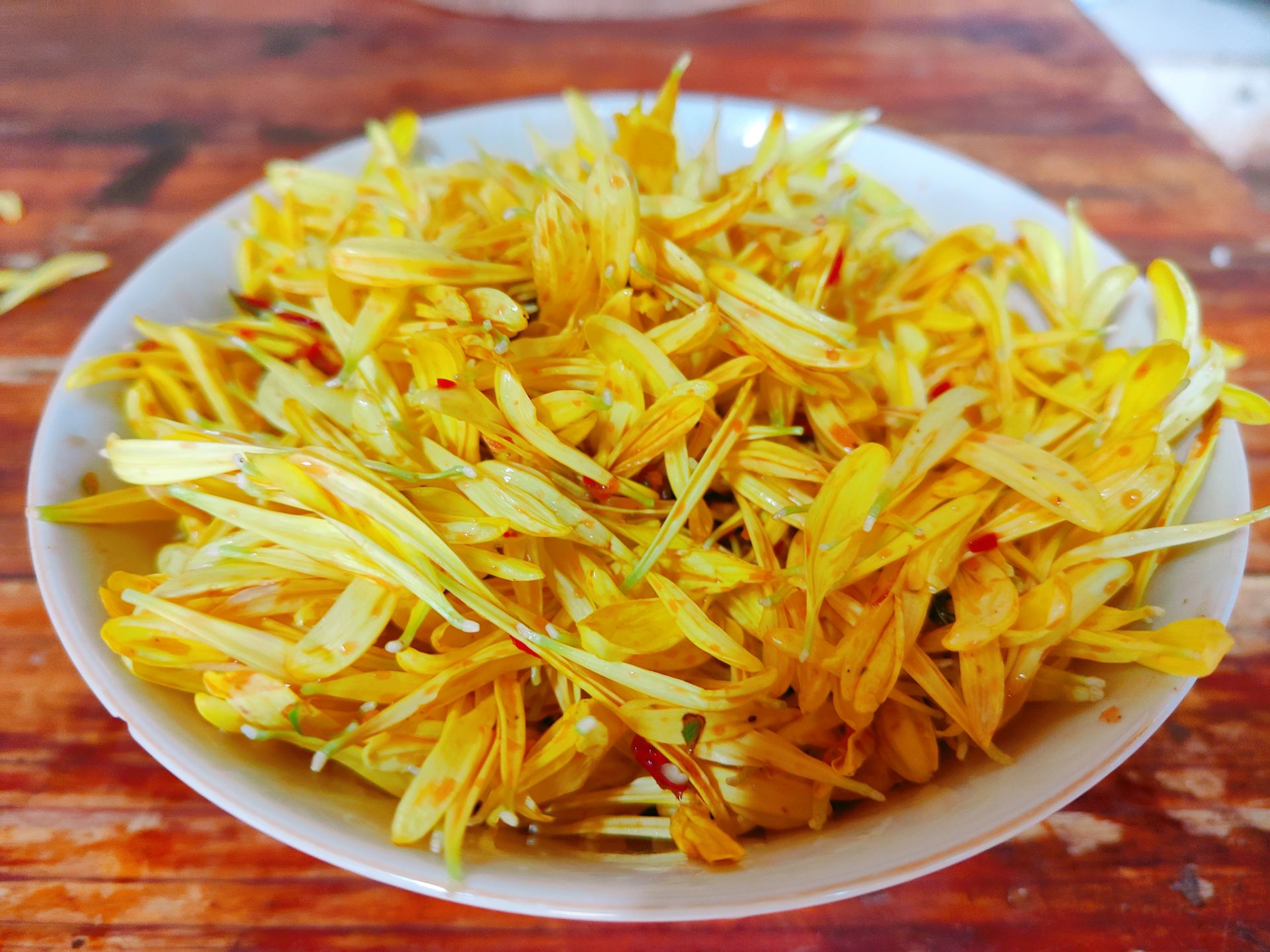 《本草纲目》中对菊花的药效有详细的记载,性甘、微寒,具有散风热、平肝明目之功效。《神农本草经》认为,菊花能“主诸头眩、肿痛、轻身耐劳延年。”菊花不仅美味,还对人体有诸多益处,属实是夏季的不二选择。眼前的这些菊花不仅有观赏性,还可食用且食用方法多样,可炖汤、作为过桥米线配料,更可制成菊花豆腐、菊花酥、凉拌菊花、泡菊花茶等。菊花豆腐细腻嫩爽,入口即化,菊花香气馥郁包裹你整个口腔;菊花酥外壳酥脆,内陷鲜香,让你欲罢不能;凉拌菊花鲜甜香辣,让你体验味蕾大爆炸;菊花茶味微苦,入口后回甘,清凉解暑!