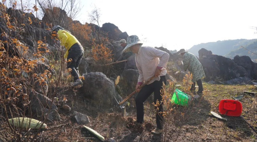 据介绍,庄子田居民小组属典型的喀斯特地貌,土地石漠化面积达80%以上,共有106户475人,现有集体荒山1700余亩。此次栽种的面积则是充分整合小组范围内各家各户的荒山,以股东的形式让每一户居民参与进来,然后通过村集体统一指导栽种、收购、销售,真正让荒山变金山。
