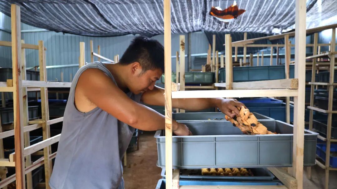 喙尾琵琶甲凭借“短平快”的特点吸引了周边农户纷纷参与养殖。为了带领大家一起增收,杨灿与合伙人成立了合作社,为村委会的农户提供种苗。通过上门指导解决养殖难题,等到虫子羽化后,还会以每公斤300元保底回收,若市场行情较好,则会优先以市场价回收,消除农户“养得出、卖不掉”的顾虑。