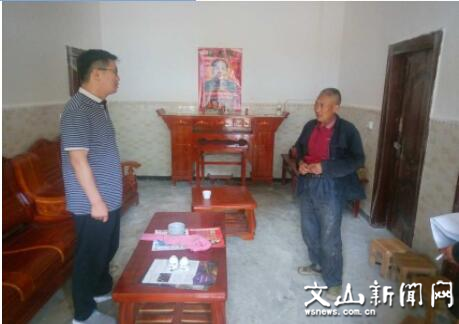 近日,中国人寿文山分公司销售总监李仕荣在西洒镇老塘地脱贫销号工作队和村委会有关人员的陪同下,深入公司挂钩45户建档立卡户开展包括产业发展、危房改造、收入摸底等各项脱贫工作推进情况的遍访了解工作。图为中国人寿文山分公司销售总监李仕荣到农户家走访。
