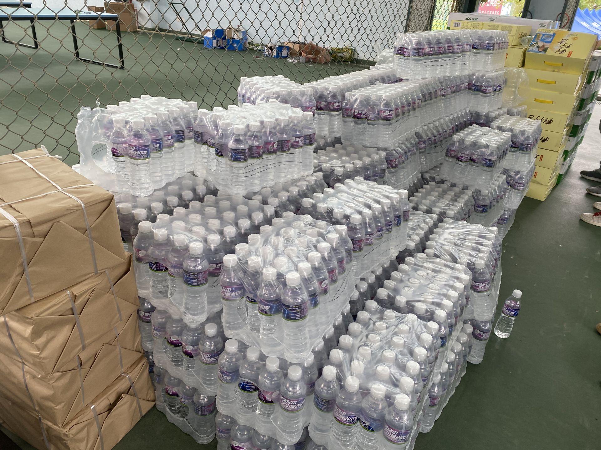 为保证新冠疫苗接种时工作人员们的用水,其他企业和各单位送来矿泉水和其他物资。