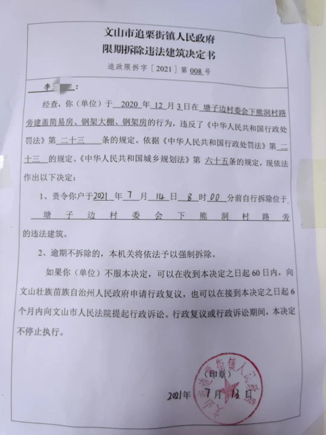 私搭乱建 占用耕地 无视整改通知 近日 文山市依法拆除25户 7000多平方米违建 同时拆除5000多平方米危房 新平街道:拆除23户违建 7月14日,新平街道联合公安、交警、市城乡综合执法局、市自然资源局等部门对辖区内的南苑明珠小区旁原州农科院种植基地内的违法建筑进行依法拆除。 上午8点半,记者跟随执法人员来到现场看到,公路旁有不少用彩钢瓦和木板私搭乱建的房子,凌乱不堪。执法人员在拆违现场拉起警戒线,水电部门对违法建筑进行断水断电处理,市交警大队对现场交通进行管制,交通服务公司工作人员及当事人把房内的物品搬运到一旁的空地上。在确保安全的前提下,施工队用机械对违法建筑进行拆除。 据了解,原州农科院种植基地内共查出私搭乱建23户,私搭乱建面积6000余平方米,该私搭乱建行为违反了《中华人民共和国城乡规划法》第四十四条的规定。2021年5月10日,新平街道向违建的23户下发了责令整改通知书或口头通知到位,并限于2021年5月17日前自行拆除。但大家都未限期自行拆除,因此,依据《中华人民共和国城乡规划法》第六十六条的规定依法进行拆除。 同时,新平街道城管执法队在对违法建筑进行排查时,发现该基地内的原农科所办公室和职工宿舍共5幢建筑已成危房,建筑面积5000多平方米。为排除安全隐患,也、被依法拆除。 追栗街镇:900多平违建被拆 追栗街镇塘子边行政村下熊洞村小组村民李某在自家耕地上违法建盖简易房、钢架大棚、钢架房做猪圈及住房,占地面积211.15平方米,其行为违反了《中华人民共和国城乡规划法》第四十四条的规定,严重影响了文山市追栗街镇集镇总体规划实施。 依据《中华人民共和国城乡规划法》第六十六条之规定, 2020年11月6日,追栗街镇政府下发了《责令停工通知书》,李某并未履行。2021年3月1日,追栗街镇政府下发了《责令改正通知书》《行政处罚事先告知书》和《行政处罚听证告知书》,李某并未拆除。 2021年4月20日,追栗街政府对其下发了《限期拆除违法公告》《追栗街政府行政处罚决定书》《追栗街政府履行行政决定催告书》,李某仍然未履行。7月13日,追栗街政府再次对其下发《限期拆除违法建筑决定书》,李某拒不整改。因此,追栗街镇依法对其进行拆除。 同时,在当事人的配合下,该村另外一户753.26平方米违建也被拆除。 文山市将进一步加大 违法占用耕地建房和 违规建房行为的政策宣传 和日常巡查力度 做到早发现早制止 拆早拆小 最大限度减少群众损失 做到拆控并举 杜绝新增违建情况的发生 (来源:文山市融媒体中心) (编辑:李云淑 排版:张振飞 审核:资云波)