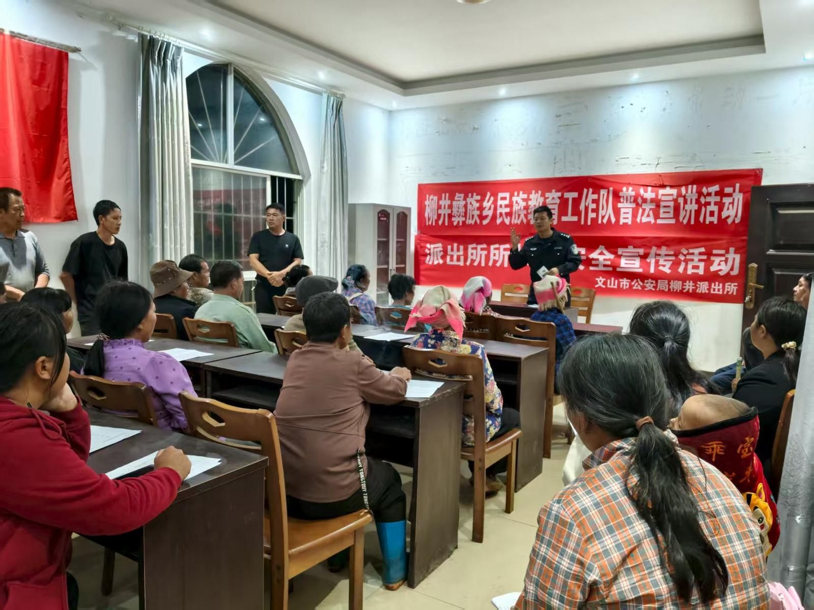 农忙的喧嚣随夕阳沉入山巅,夜幕如墨色绸缎轻覆柳井乡的田野与村寨。雨后的空气里浸着泥土的清香,零星犬吠更显乡村夜的静谧。然而,新发寨铁厂村等村组的文化活动室却灯火通明、暖意融融——柳井彝族乡民族教育工作队正在这里开展“乡村法治夜话”活动,用拉家常的方式将法律知识送到群众身边,让法治之光在夜色中点亮民心。
