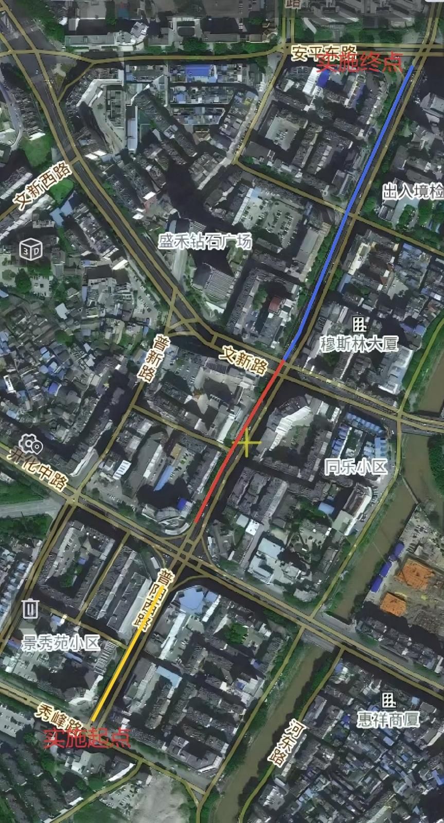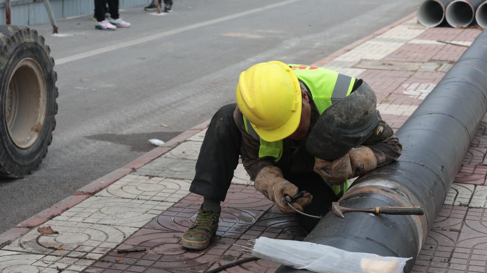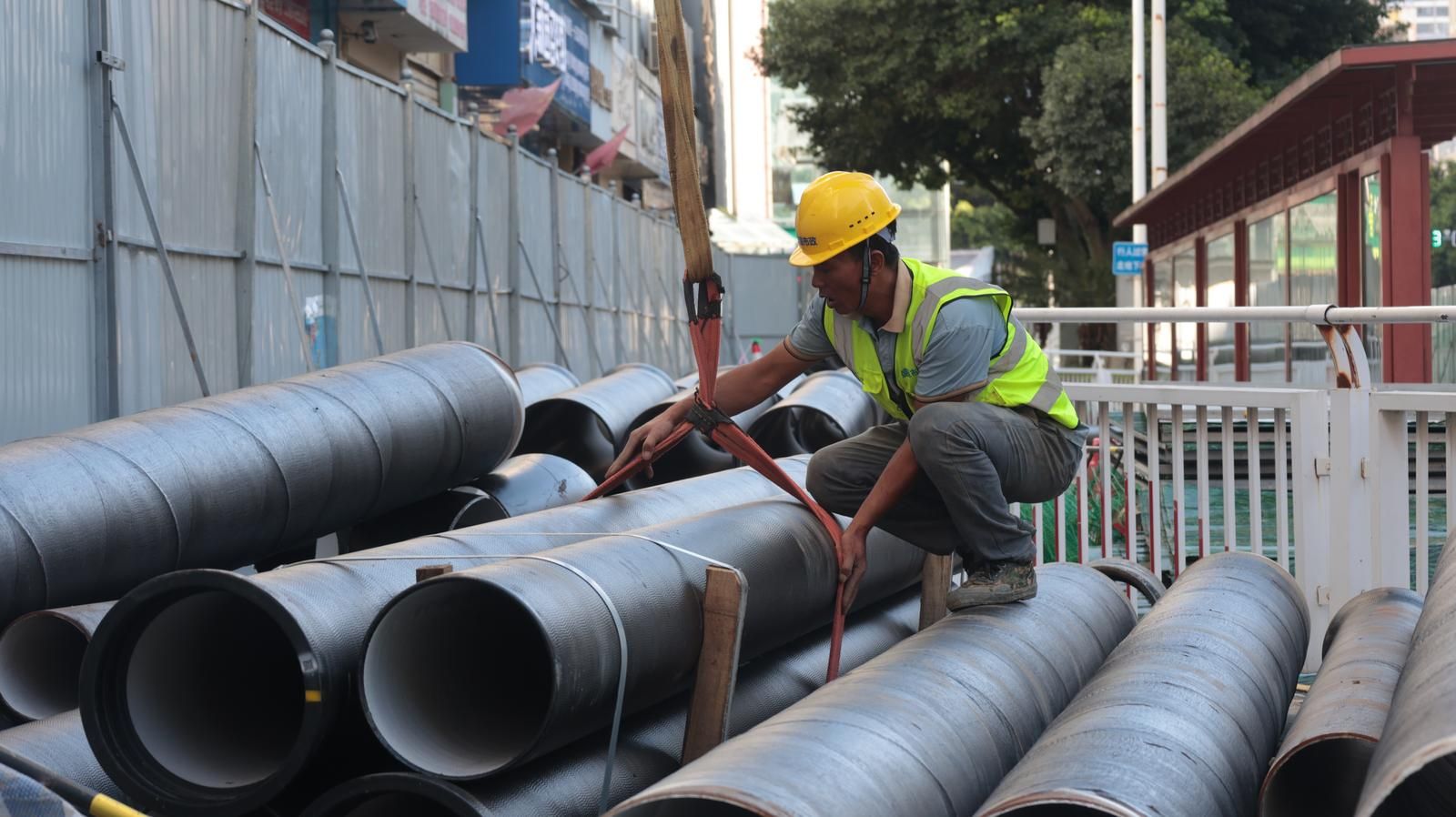 近期同步施工的还有建禾西路和瑞禾路的主干道,两条路的第一段均已完成管道铺设,施工人员正在进行回填准备工作,第二段也已经设好围挡开工,工人们正熟练地对吊运放置好的管道进行焊接作业,火花四溅中,一段段新管道被牢固连接。