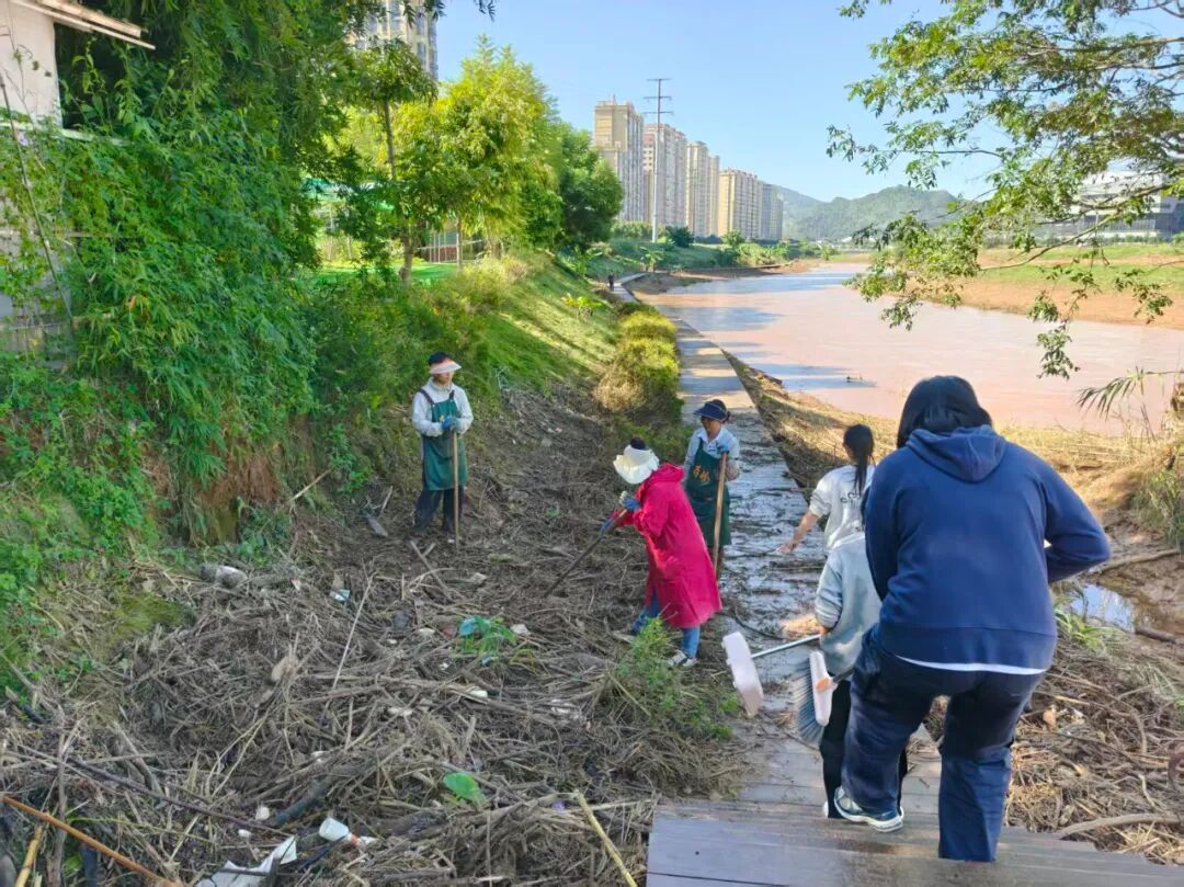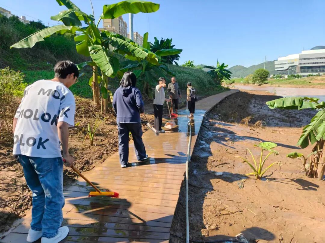 在现场,党员干部们分工明确,有的负责用铲子铲除栈道上厚厚的淤泥,动作熟练而有力,每一铲都带着对恢复社区环境的决心;有的则拿着扫把,仔细清扫残留的细小杂物,不放过任何一个角落;还有的拉着水管,用强劲的水流冲洗栈道,将顽固的泥渍一一冲走。
