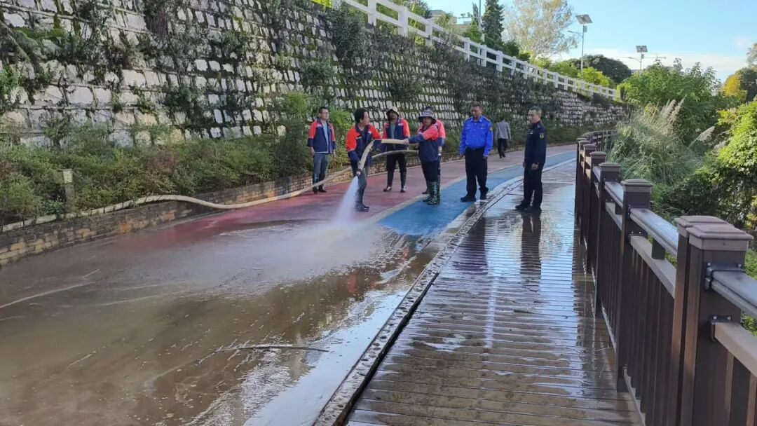 文山市综合行政执法局副局长孙立斌说:“连续的台风过后,文山市综合行政执法局聚焦城市环境,重点针对盘龙河流域,步道及绿化淤泥堆积情况,迅速组织各方力量开展清淤冲洗工作。经排查,州政府至新兴桥段有23处沿河栈道、210根围栏及部分绿化被洪水冲毁,现在正在备料,计划10月12日开始修缮。后续我们将全面排查沿河设施安全隐患,确保在最短时间内恢复市民亲水休闲空间。”