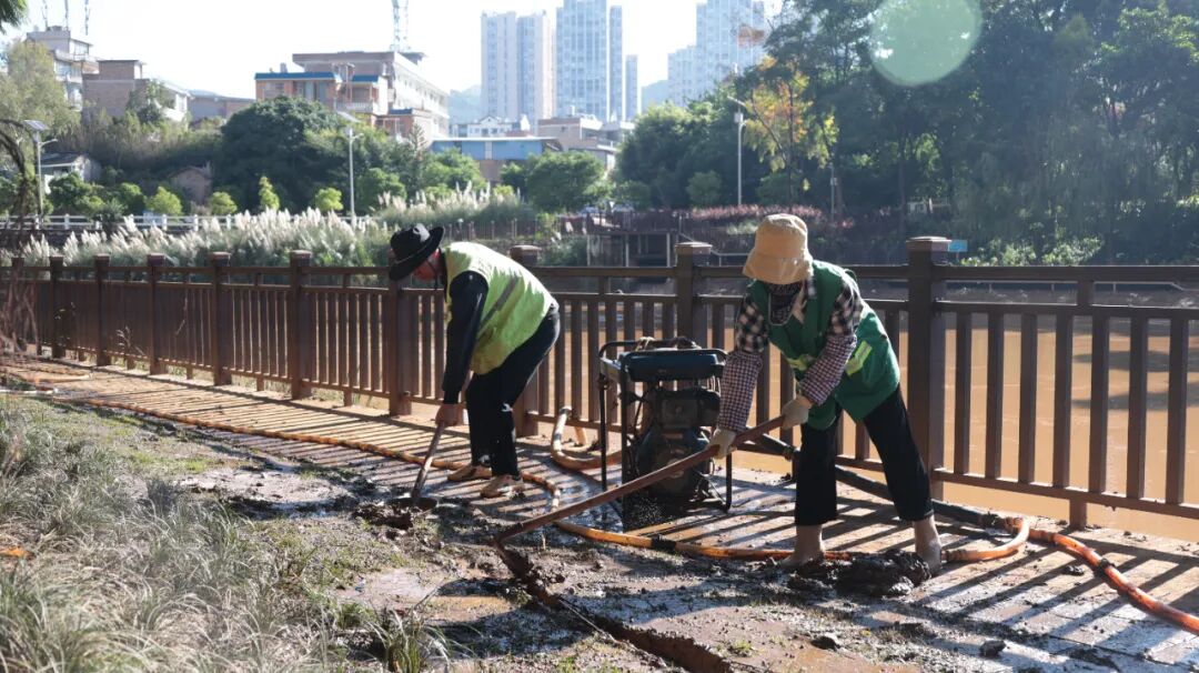 祥民社区工作人员告诉记者,部分栈道板上的淤泥因沉积时间稍长,已变得紧实黏稠,仅靠人工清扫难度大、效率低。为此,社区正积极协调高压水枪冲洗栈道淤泥。