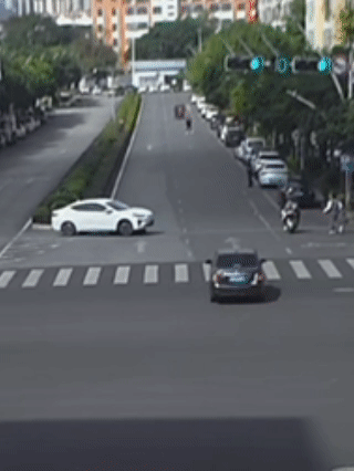 被一辆白色轿车撞倒后卷入车底