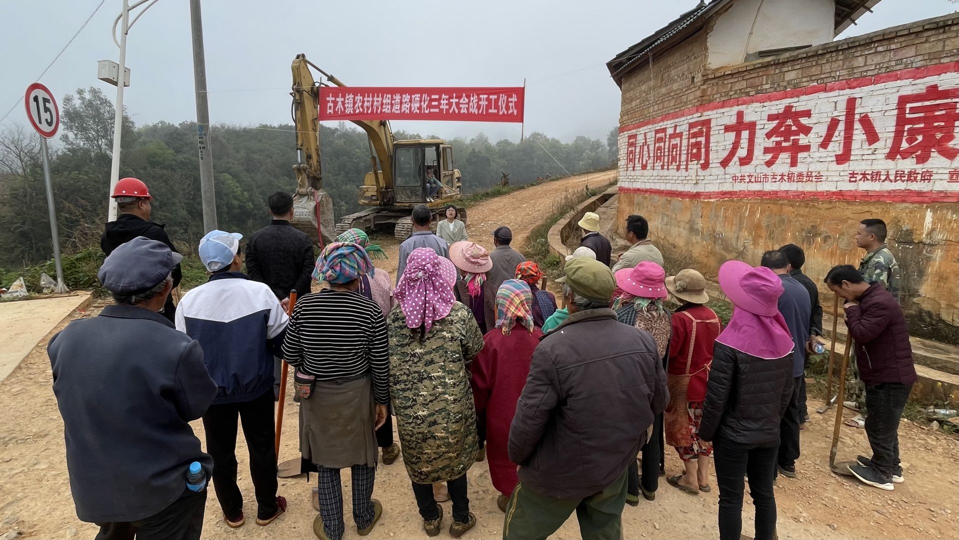 上午9时,在古木镇阿富村委会阴洞村村口记者看到,挖机已就位,现场还在显眼处拉起了写有"古木镇农村村组道路硬化三年大会战开工仪式 "字样的横幅,古木镇政府主要领导、村干部及辖区群众和施工方来到了现场。随着古木镇党委副书记、镇长鲜思菊宣布开工后,现场机器轰鸣,在鞭炮中全面启动古木镇农村村组道路硬化三年大会战。