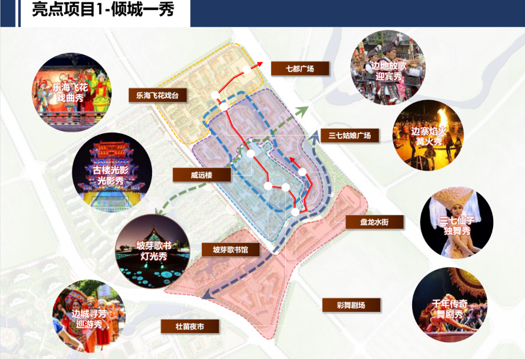整个七都古镇以 “七都文化”为核心,将建设8个文化公建、2大文旅产品、1大品牌节庆、3大主题街区、11个特色商业以及11个核心景观。并以三七文化为主线,串联七都广场、三七姑娘广场、威远广场三大广场,串联戏台、仙草奇缘艺术馆、威远楼三大公建,串联开花街、忆巷食街两大主题街巷,打造一台三七文化主题鲜明的七都好戏,形成旅游环线。