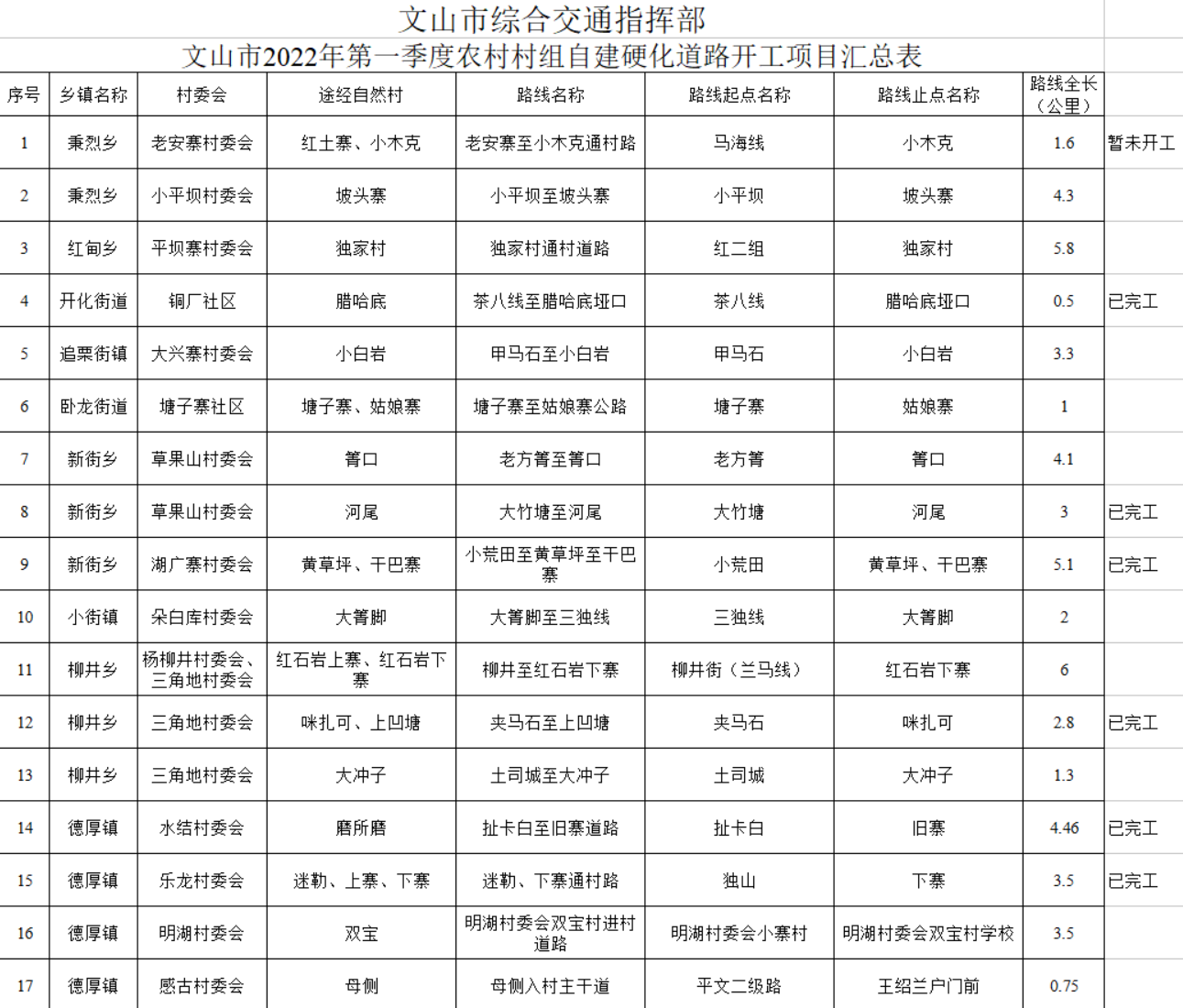文网讯 文山市自启动实施农村村组自建硬化道路建设以来,在建项目高效有序推进,目前开工38条,完工15条。