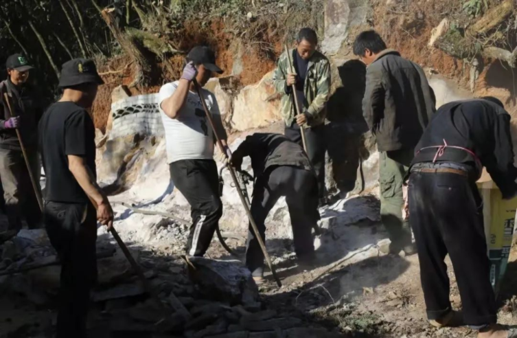 近日,在土司城村记者看到,村民们无论男女老少都积极参与到入村道路的扩宽修建当中,年轻力壮的汉子手持铁锤、炮杆等工具,奋力清除路边的石块,年迈的老人则挥舞着锄头清理路边的泥土。