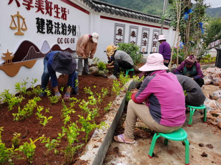 一大早,记者来到他披村看到,文化墙下的花坛里已经种上了许多株生机勃勃的小花苗,花坛旁边还有很多袋花苗等待栽种。村民和乡干部们趁着好天气,分工合作,有的挖坑、有的培土、有的栽苗、配合默契,忙得不亦乐乎。