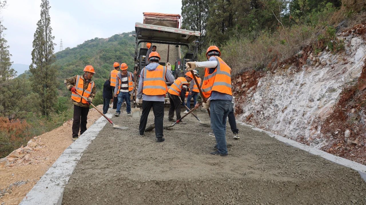 施工现场,记者看到一片繁忙的景象,施工队伍正在分段作业,有的在架设路基模板,有的则忙于混凝土浇灌,已完成路基建设的路段上,数十名工人正配合机械设备进行水稳层铺设,并使用压路机进行压实作业。原来,他们正在修建一条森林防火通道。