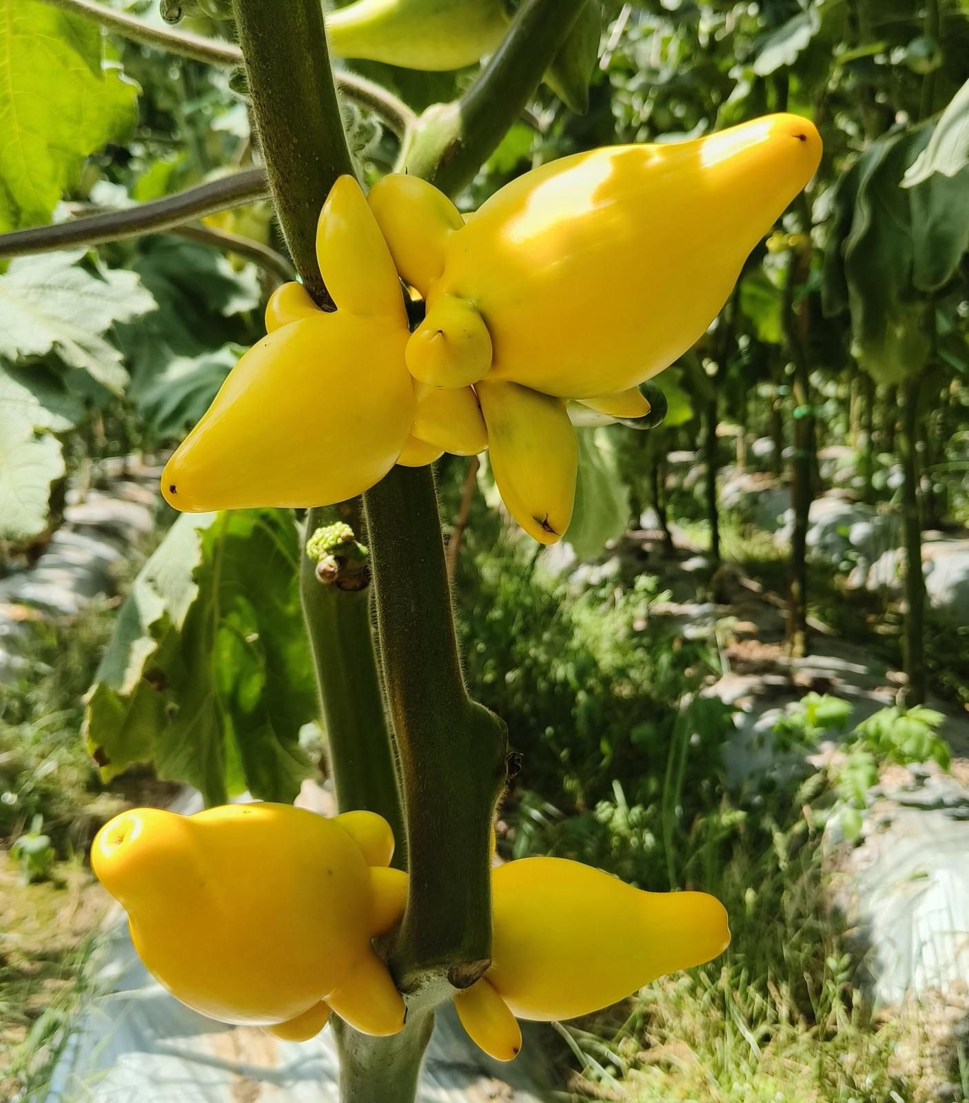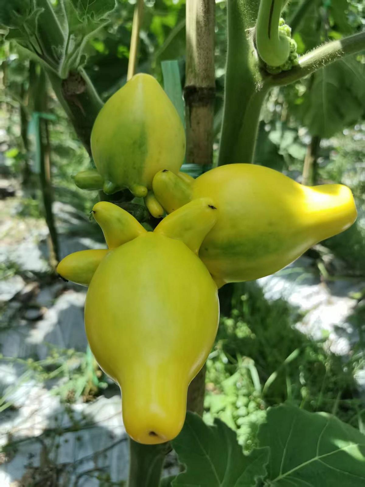 这种植物原产于美洲热带地区,如今已在云南、广东、广西等地扎根。和晶华说:“我们今年5月在喜古乡种植五代果近80亩,这也是文山州首次培育该品种。其生长周期约6个月,文山首批五代果将于10月上市,销售期可持续至12月。五代果植株高两米左右,多呈两枝分叉生长,每枝都挂着‘小猪佩奇’,一枝能卖10元到30元,整株或单个售卖都不浪费。”