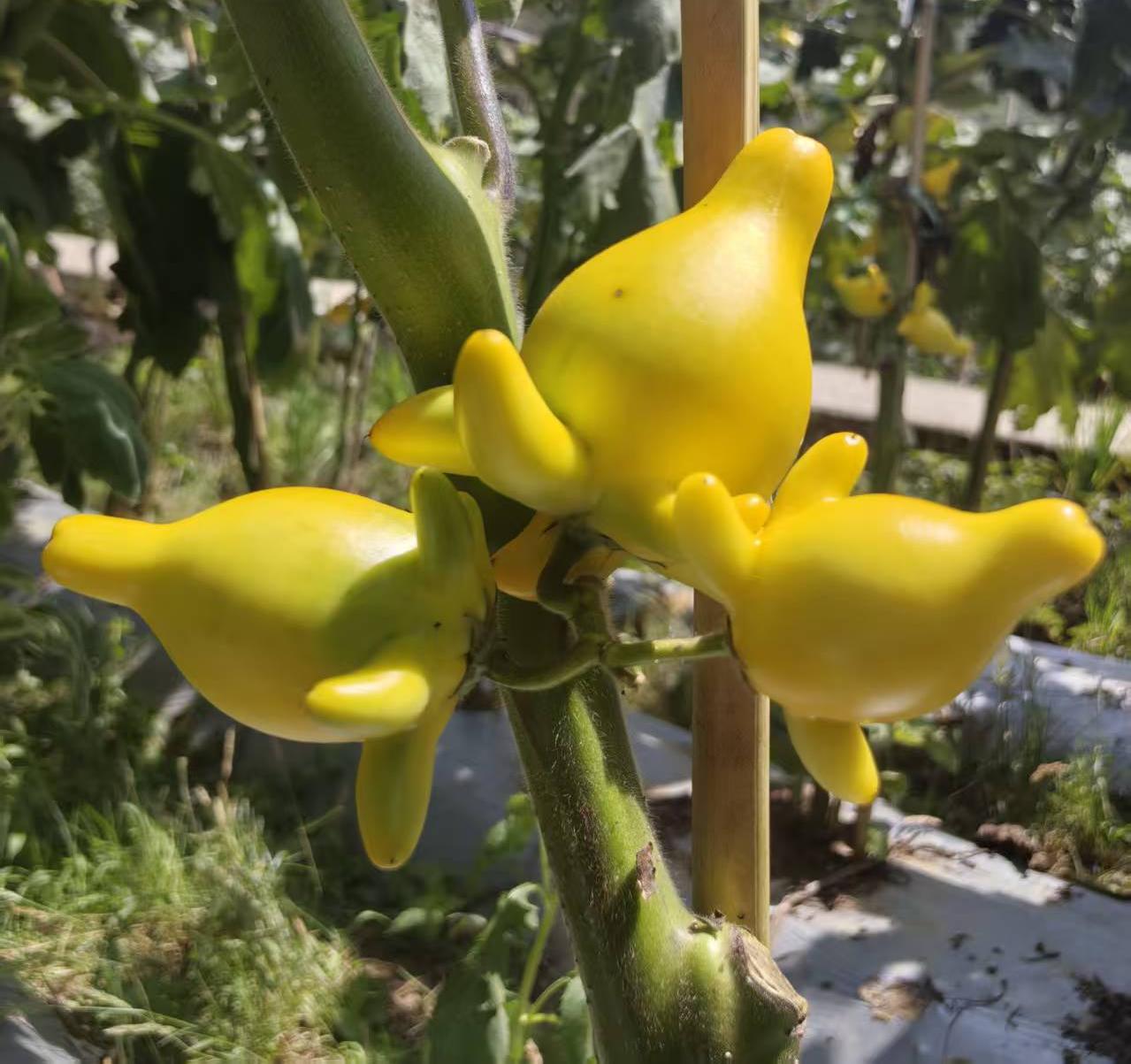 “这是五代果,也叫黄金果、五指茄、乳茄,属于茄属直立草本植物。由于外形长得像动画片《小猪佩奇》里的‘佩奇’,大家都叫它‘小猪佩奇’。”云南铭洋花卉种植有限公司基地厂长和晶华笑着解释。五代果呈倒梨状,成熟时为金黄色,色泽鲜艳。别看它长得可爱讨喜,却只能观赏不能食用。它是优良的观果植物,自然风干后可保持数月色泽鲜艳、形态完好,不易变色干缩,常用于切花和盆栽装饰,还因“五代同堂、五福临门、金玉满堂”的美好寓意备受喜爱。