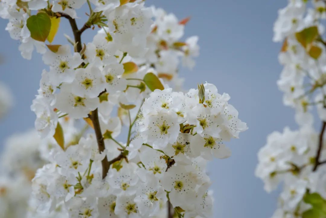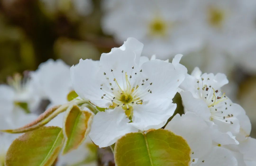 细细看去,朵朵梨花竞相吐蕊,沐浴在春光里,一阵清风拂去,花瓣在微风中含烟带雨,纷纷而落,缕缕清香沁人心脾,空气中也带着春天的甜甜气息。漫步梨园,每一步都能和梨花相遇,微风拂过,花瓣轻落肩头,花香四溢。
