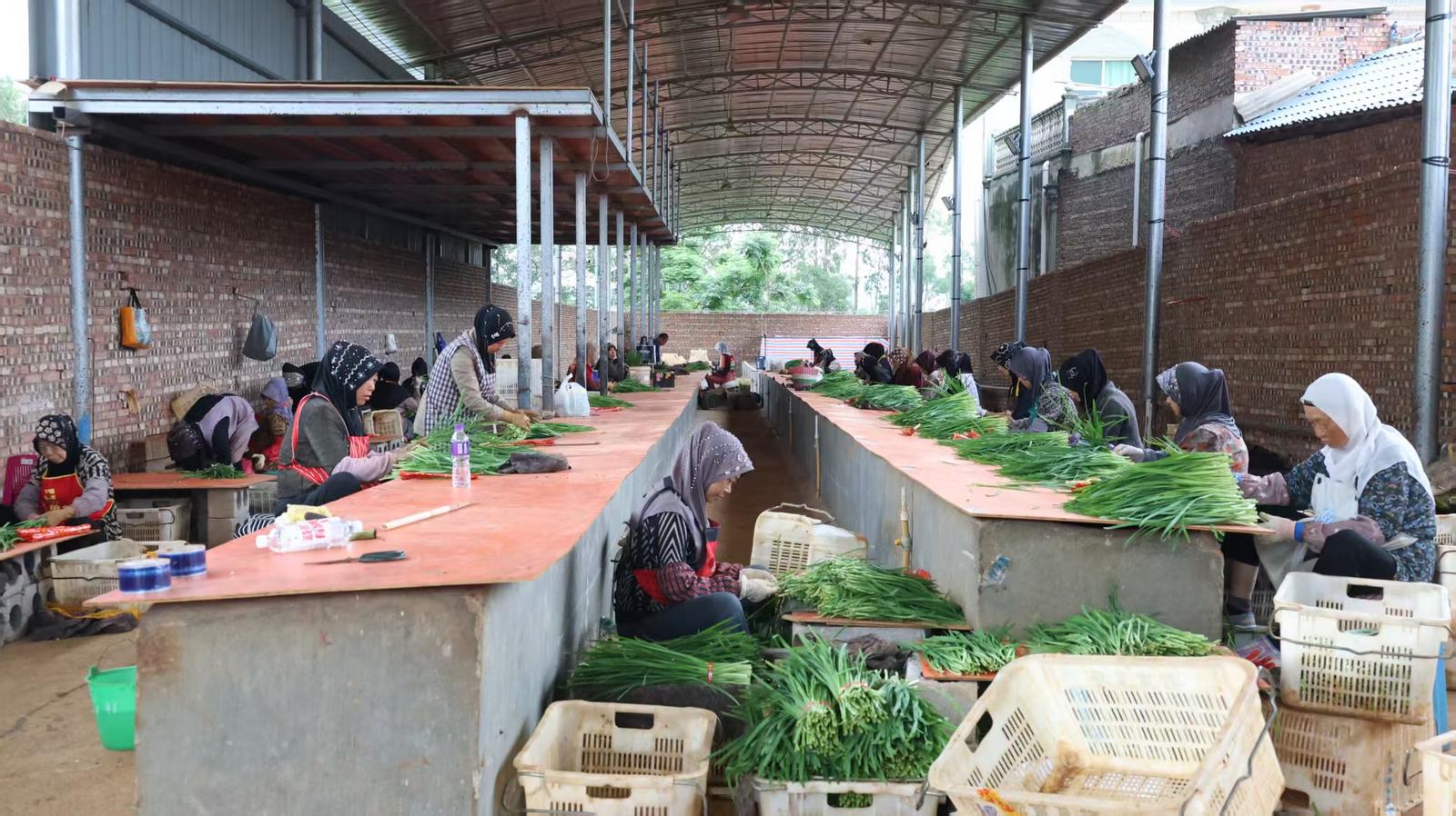 在茂克村,一座700多平方米的彩钢瓦大棚韭菜分拣厂格外醒目,分拣厂内设置6列固定分拣台和4个灵活工位,日处理能力达4吨。通过立足地理条件优势,引进近邻乡镇种植企业万宝春园农业科技公司到村内设置韭菜分拣厂,形成了“种植在稼依、分拣在茂克”跨区域协同模式,为茂克村及周边村民提供300余个就业岗位,在薪酬上采用计件模式,日均收入100—120元,帮助群众实现“务工不出村”。