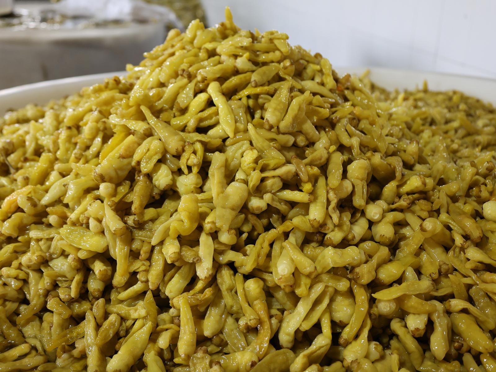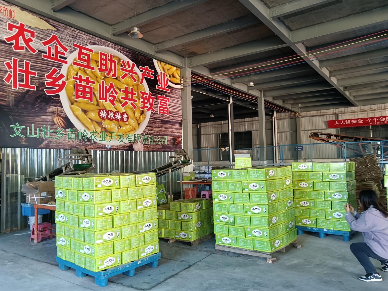 玉米烘干中心对面,是文山壮乡苗岭公司投资运营的秉烈乡泡椒加工厂。走进公司生产车间,新建的104个泡池里正在泡制的小米辣、小黄姜芳香扑鼻而来。公司负责人马杰超介绍,因文山小米辣品质好,加上制作过程严格把控,制好的泡椒产品热销全国40多个地区。2025年公司收购辣椒2000余吨,预计产值1500至2000万元。“我们销路广,收购价有竞争力,椒农更有‘赚头’,工厂货源也更稳定”,马杰超说,工厂还能提供50个岗位,带动群众就近务工增收。